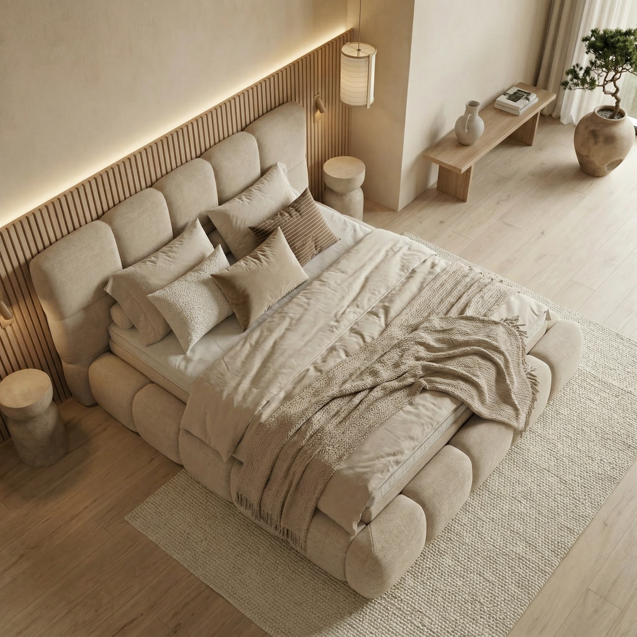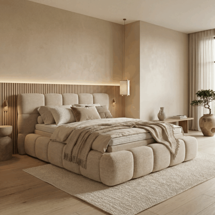 Het Merci bed brengt rust, comfort en stijl samen in een modern Japandi ontwerp. Door het lage model, de zachte blokvormige afwerking en de luxe uitstraling past dit bed perfect in een rustige en sfeervolle slaapkamer.